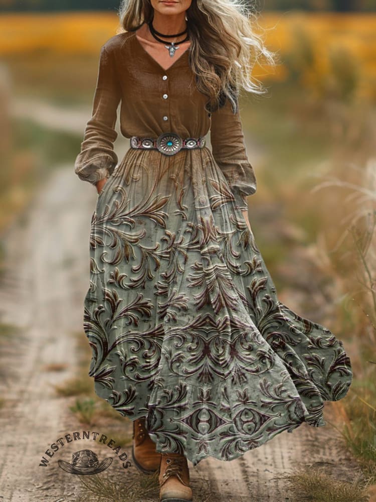 🔥Hot Sale🔥Women's Classic West Print V-Neck Button Pocket Cotton Dress