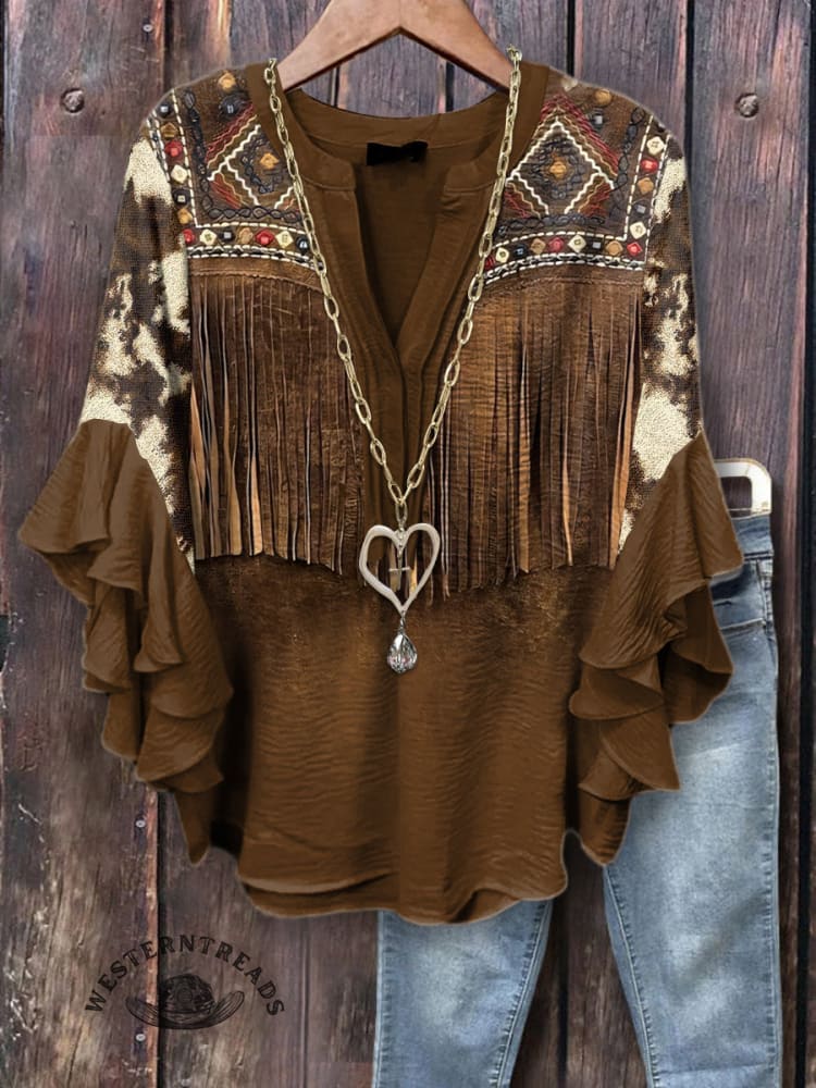 Women's Denim Textured Print Ruffle Sleeve Top