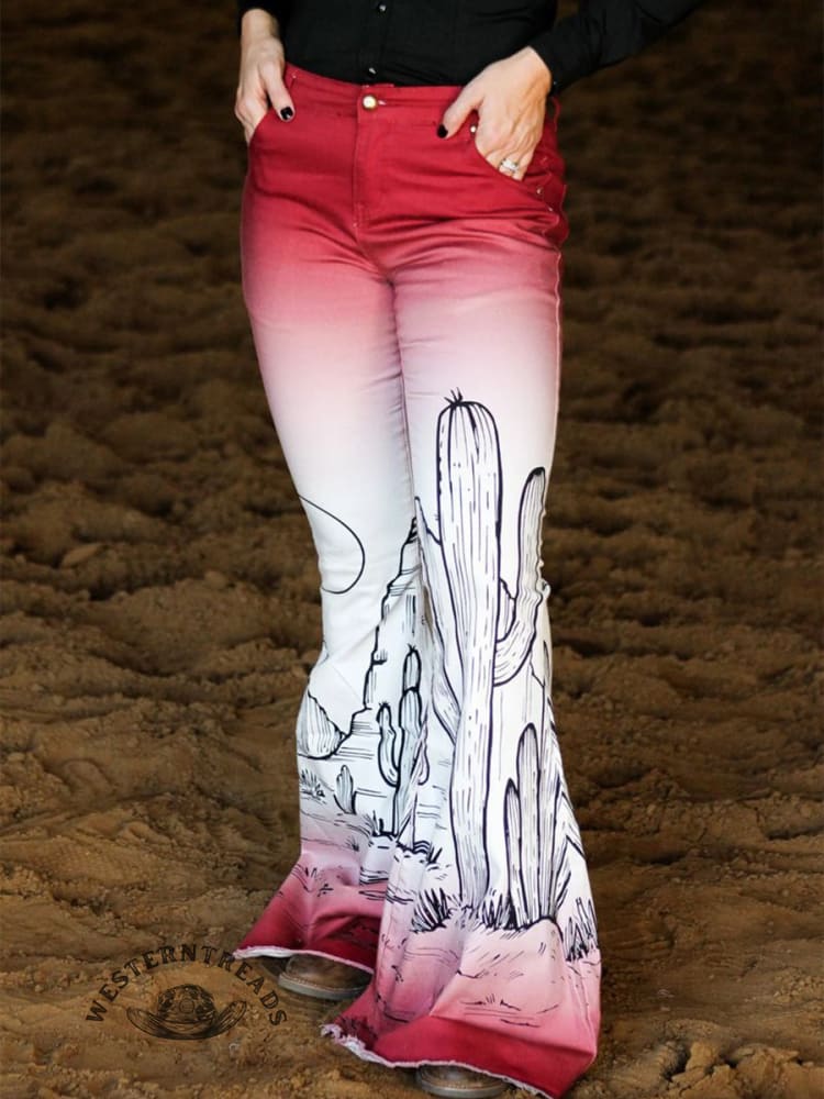 Women's Vintage Western Cactus Pattern Print Casual Wide Leg Pants