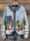 Retro Christmas Tree Print Patchwork Denim Knit Pullover Sweater
