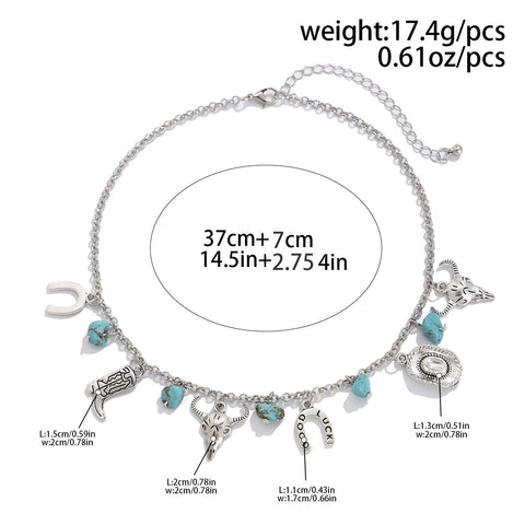 This turquoise bullhead boot necklace features a striking bullhead pendant, complemented by western-themed charms like boots and horseshoes. The combination of turquoise and silver elements creates a distinctive southwestern style, making it a standout piece for any jewelry collection.