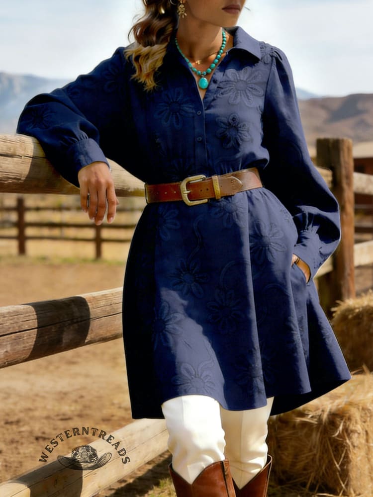 Retro Women's Three-dimensional Floral Embroidered Long Sleeve Shirt DressRetro Women's Three-dimensional Floral Embroidered Long Sleeve Shirt Dress