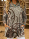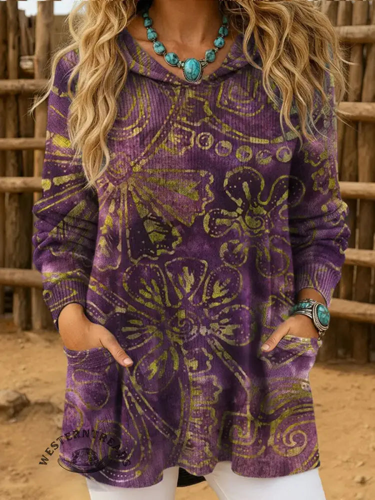 Vintage Art Print Casual Knitted Pocket Hooded Tunic Top
