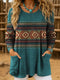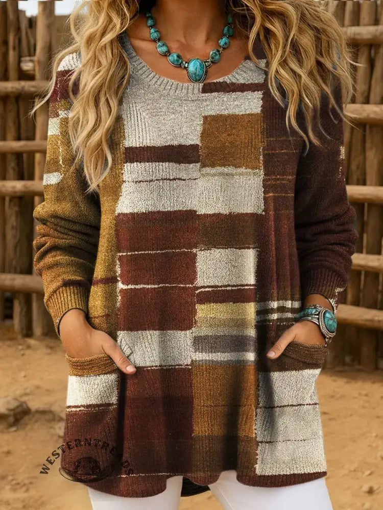 Women's Vintage Geometric Art Print Casual Crew Neck Pocket Knit Top