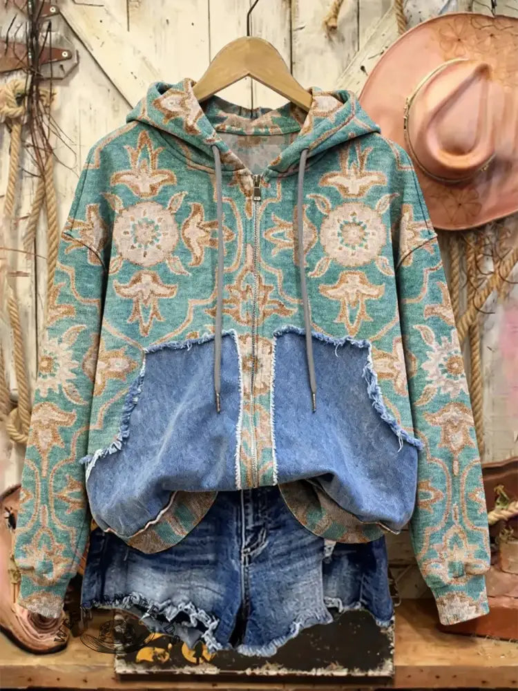 Retro Print Casual Cotton Patchwork Hooded Zip-up Sweatshirt