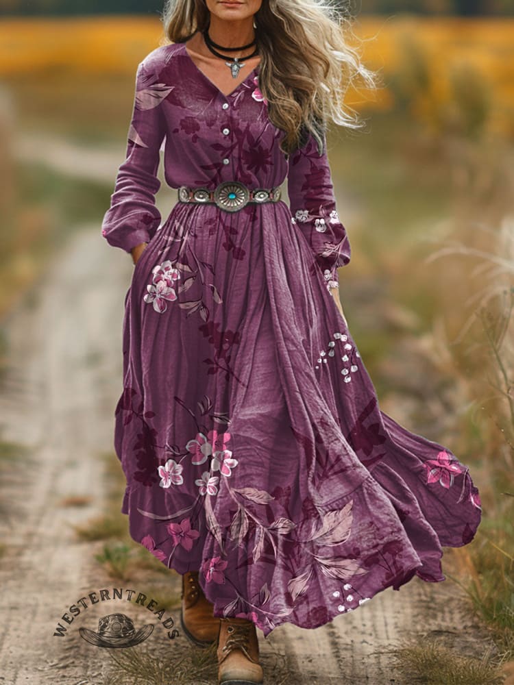 Women's Classic West Print V-Neck Button Pocket Cotton Dress
